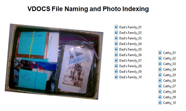 No extra charge. Please take the time to organize the photos before we scan them for you. This is easier and faster than re-naming the scans later. Put a name tag with your Photos, Slides, and Negatives, place it in a ziplock bag, or wrap it with rubber bands. We do the rest and scan your Photos, Slides, and Negatives with your chosen File Name.