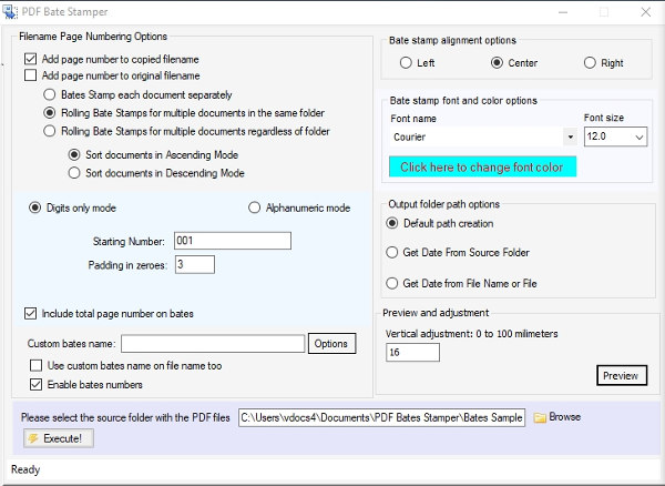 All features are available from one Control screen. This provides fast and easy batch processing of your Bates Stamping, and Numbering requirements.